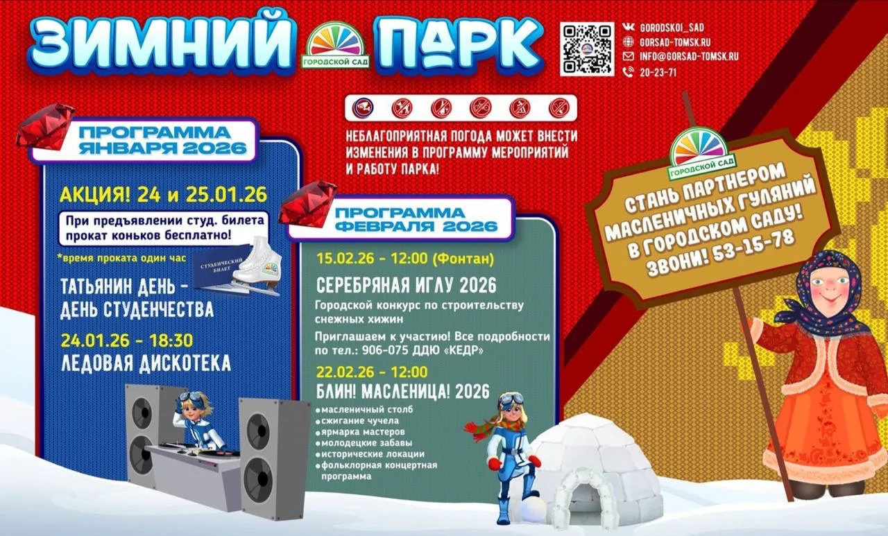 Для вас ледовая дискотека, акции, семейные мероприятия и шумная Масленица с играми, угощениями и народными забавами.