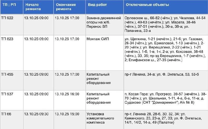 В этот день запланированы капитальный ремонт, установка измерительного комплекса и замена деревянных опор. Ознакомиться со списком адресов можно на фото.