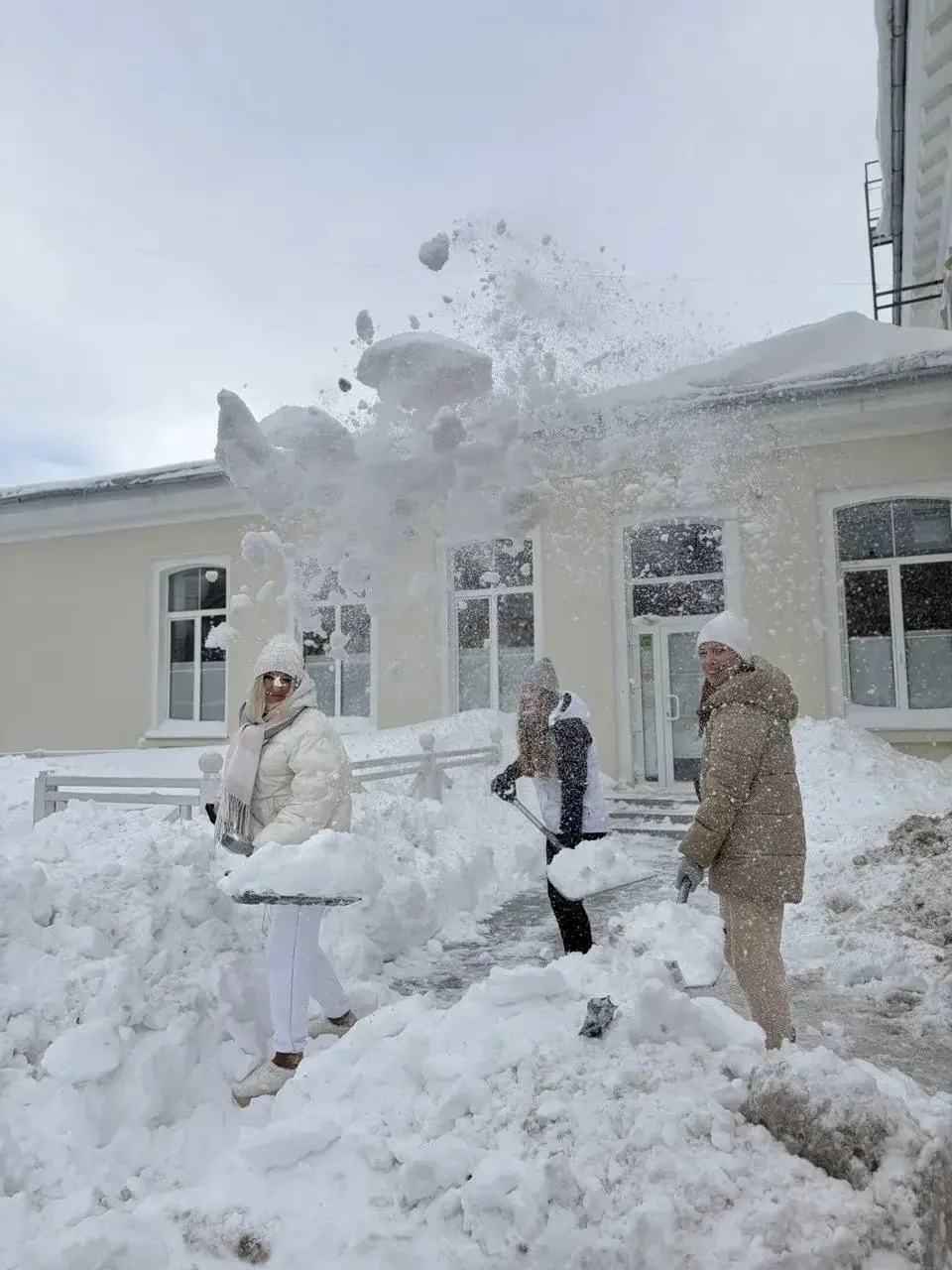 Дружно и весело вышли на расчистку снега. Молодцы! Пример всем, кто жалуется и ждёт технику - пишет наша подписчица.