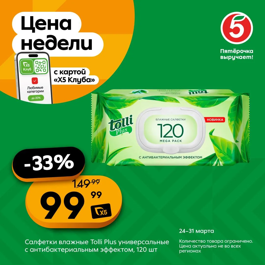 🌿 Влажные салфетки Tolli Plus с антибактериальным эффектом — 99,99 рублей.