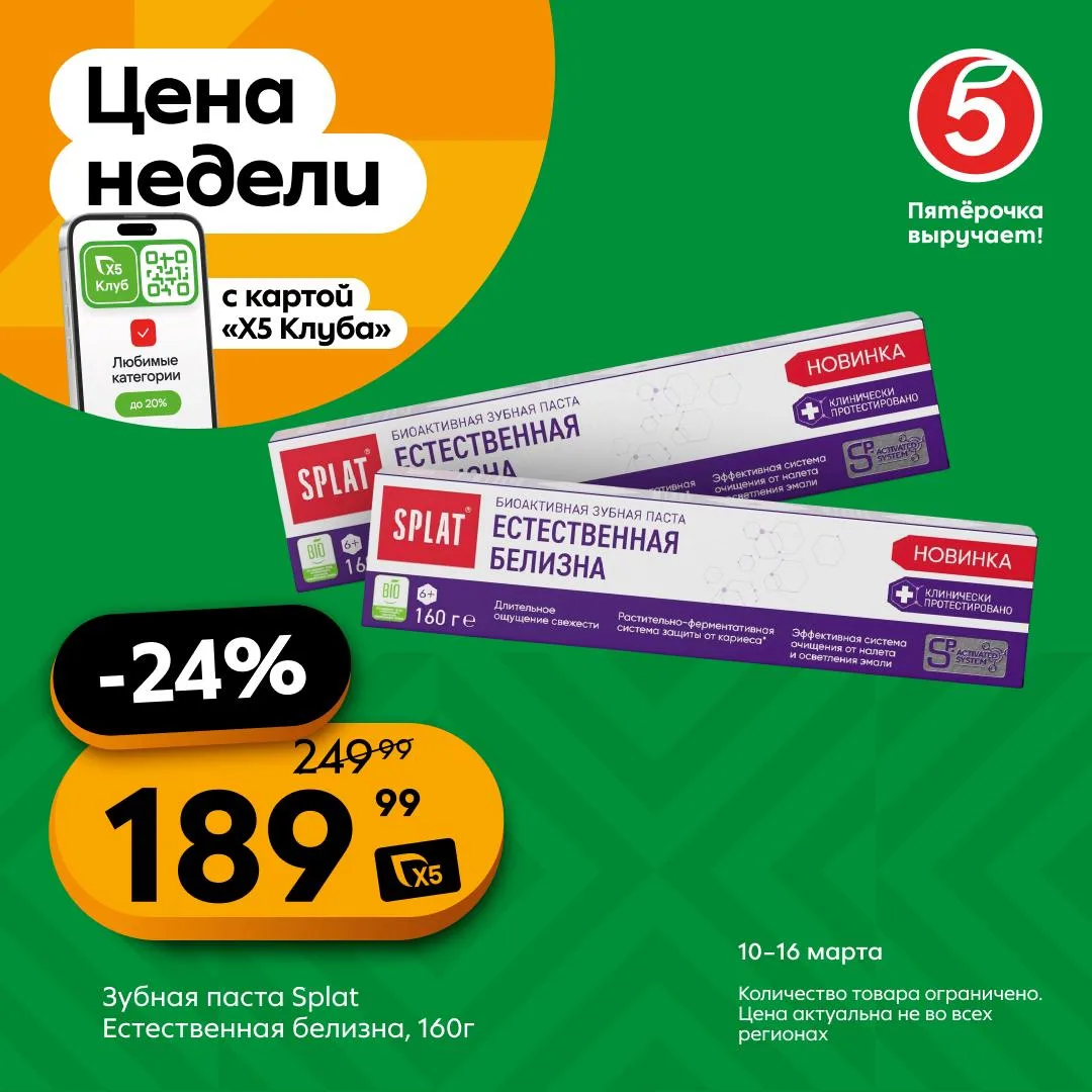 🦷 Зубная паста Splat «Естественная белизна» — 189,99 рублей (-24%).