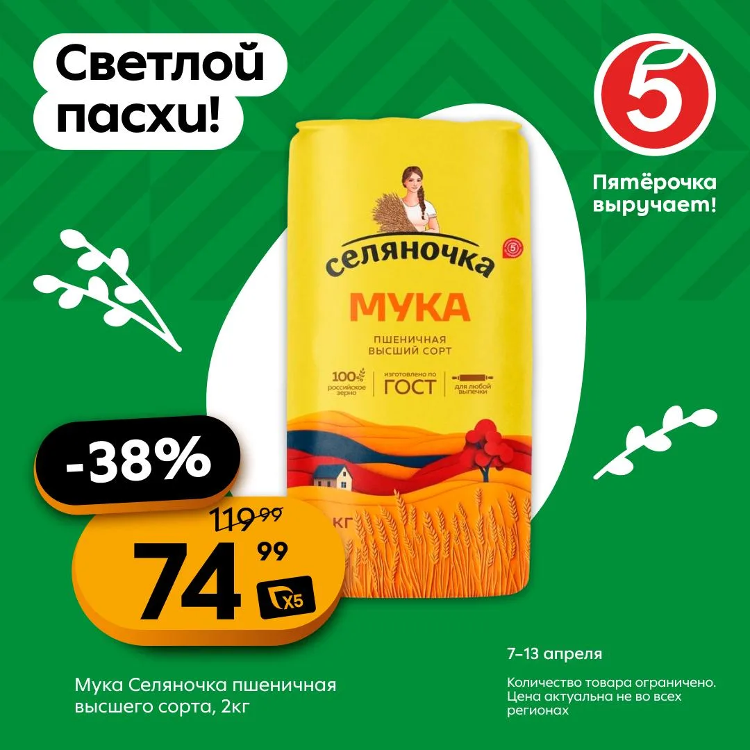 ✨ Пшеничная мука «Селяночка» — 74,99 рублей (-38%).
