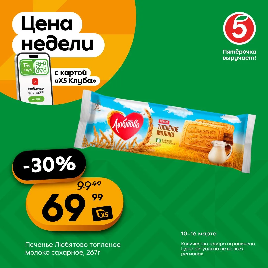 🍪 Печенье «Любятово» с топлёным молоком — 69,99 рублей (-30%).