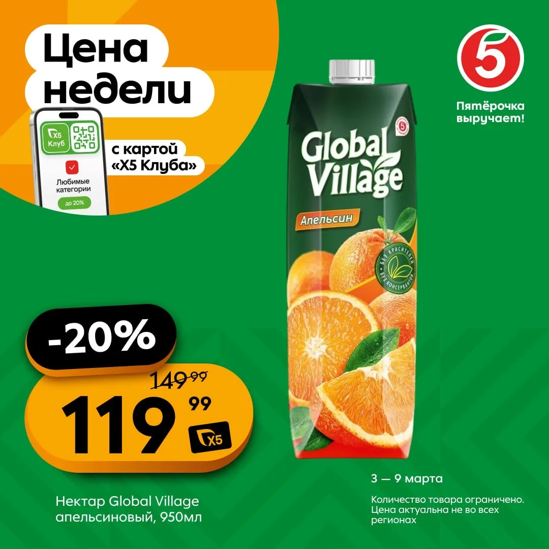 🍊 Апельсиновый нектар Global Village — 119,99 рублей.