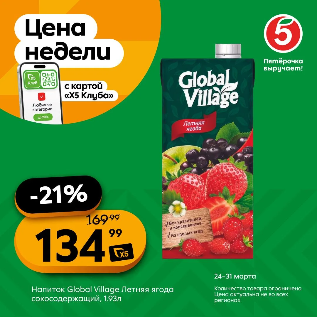 🍓 Напиток Global Village «Летняя ягода» — 134,99 рублей.