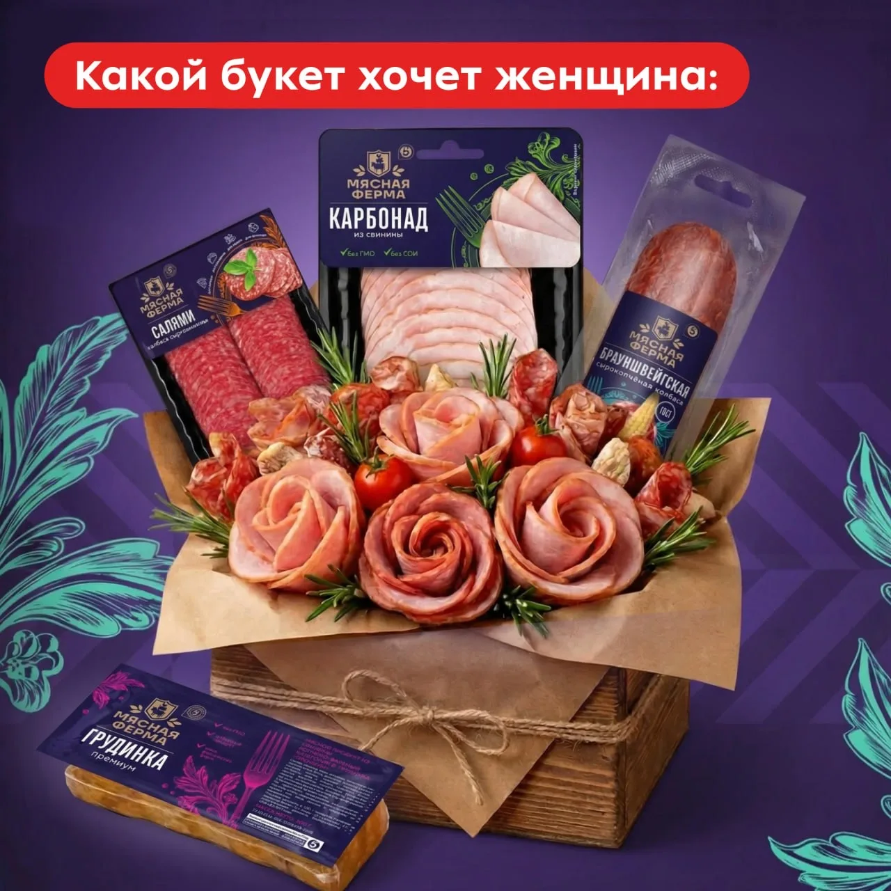 Мужчины, сохраняем! С таким букетиком от Мясной фермы незабываемый праздник обеспечен, плюс вам тоже немного достанется. Ну и, разумеется, о вас будут ходить легенды.