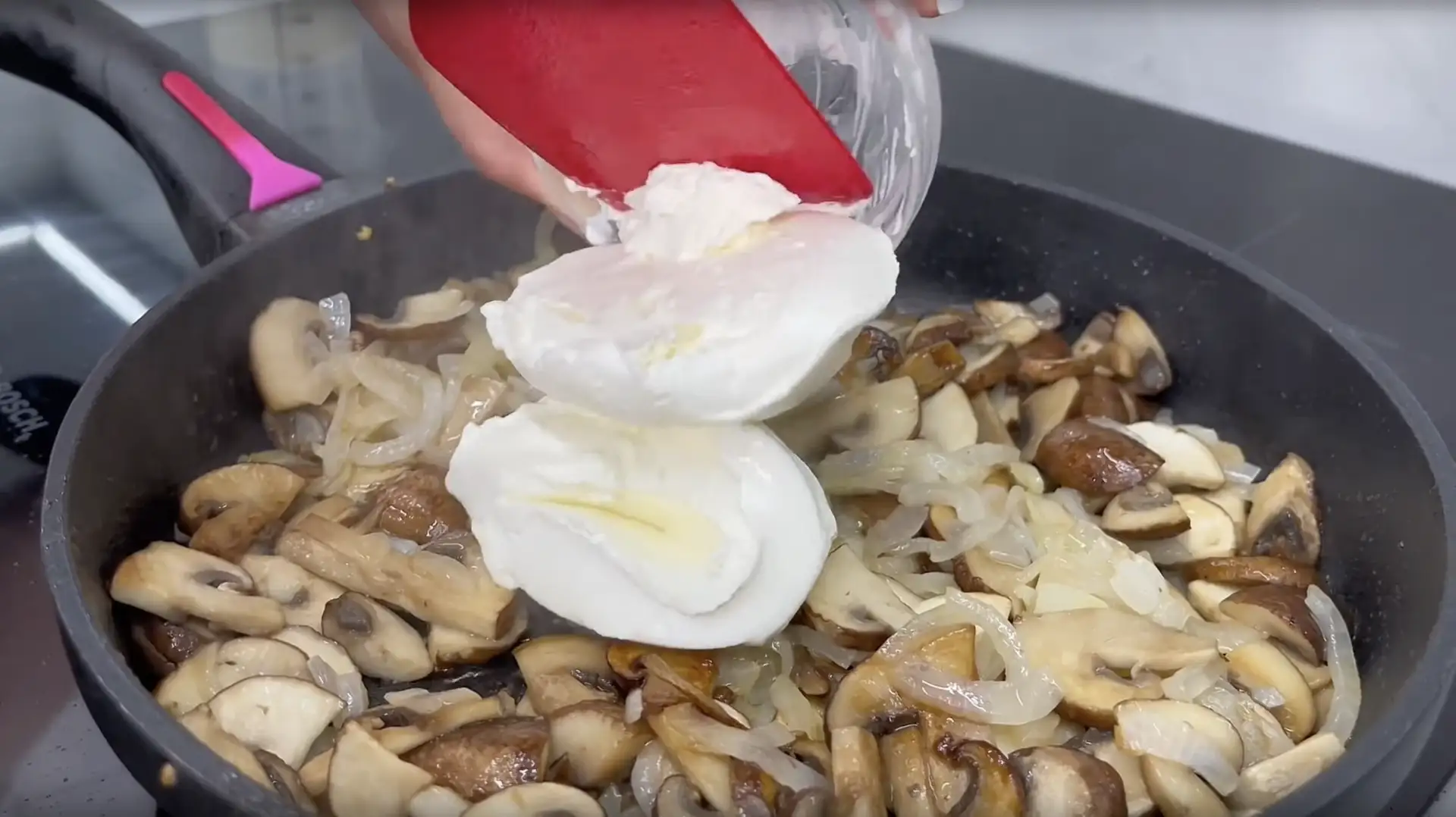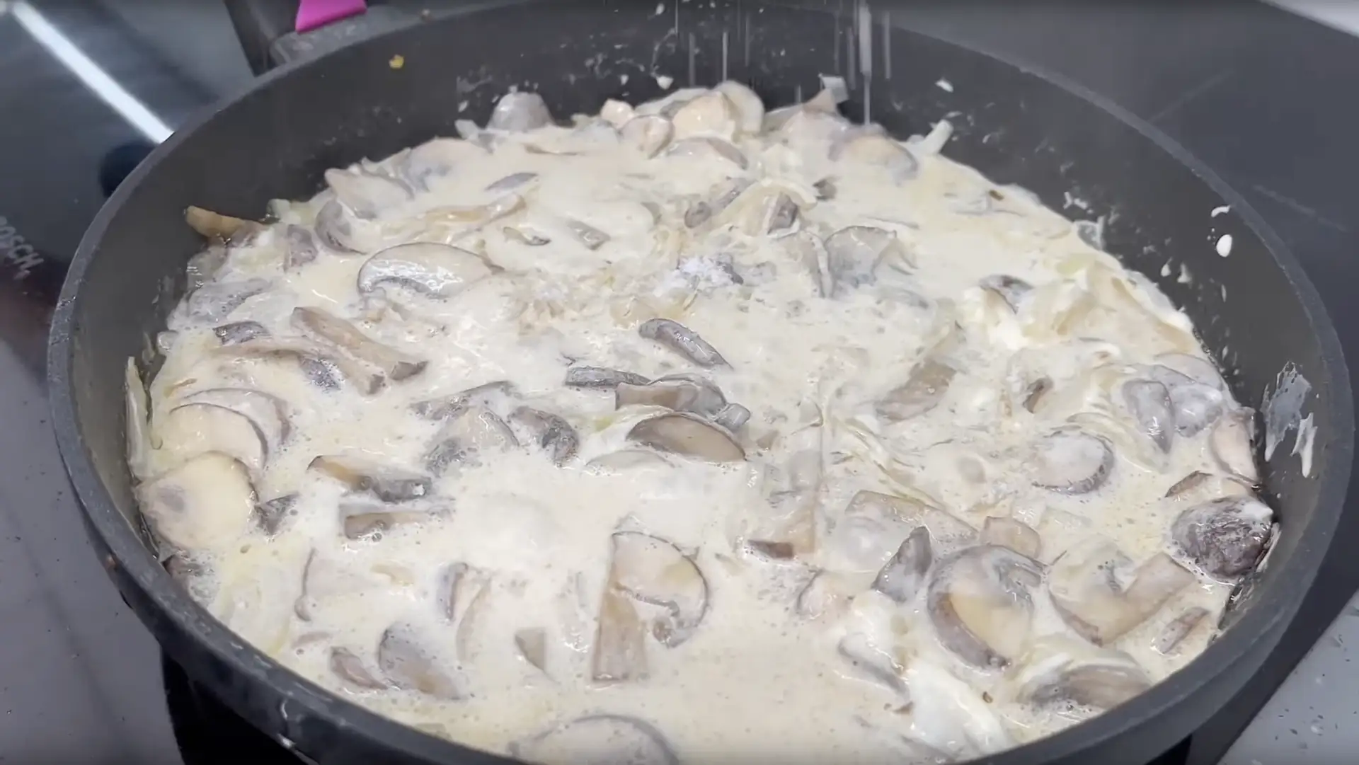 Возвращаем лук на сковороду к грибам, добавляем творожный сыр (Маскарпоне сделает соус шелковистым, а более кислый творожный сыр добавит пикантности) и сливки. Молоко подойдет, но жирные сливки (от 20%) создадут ту самую бархатистую текстуру.