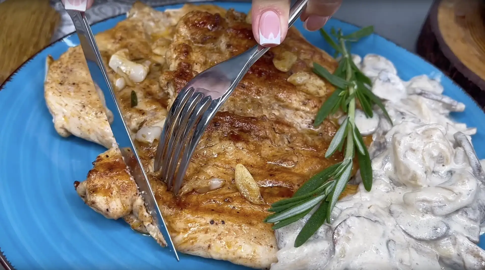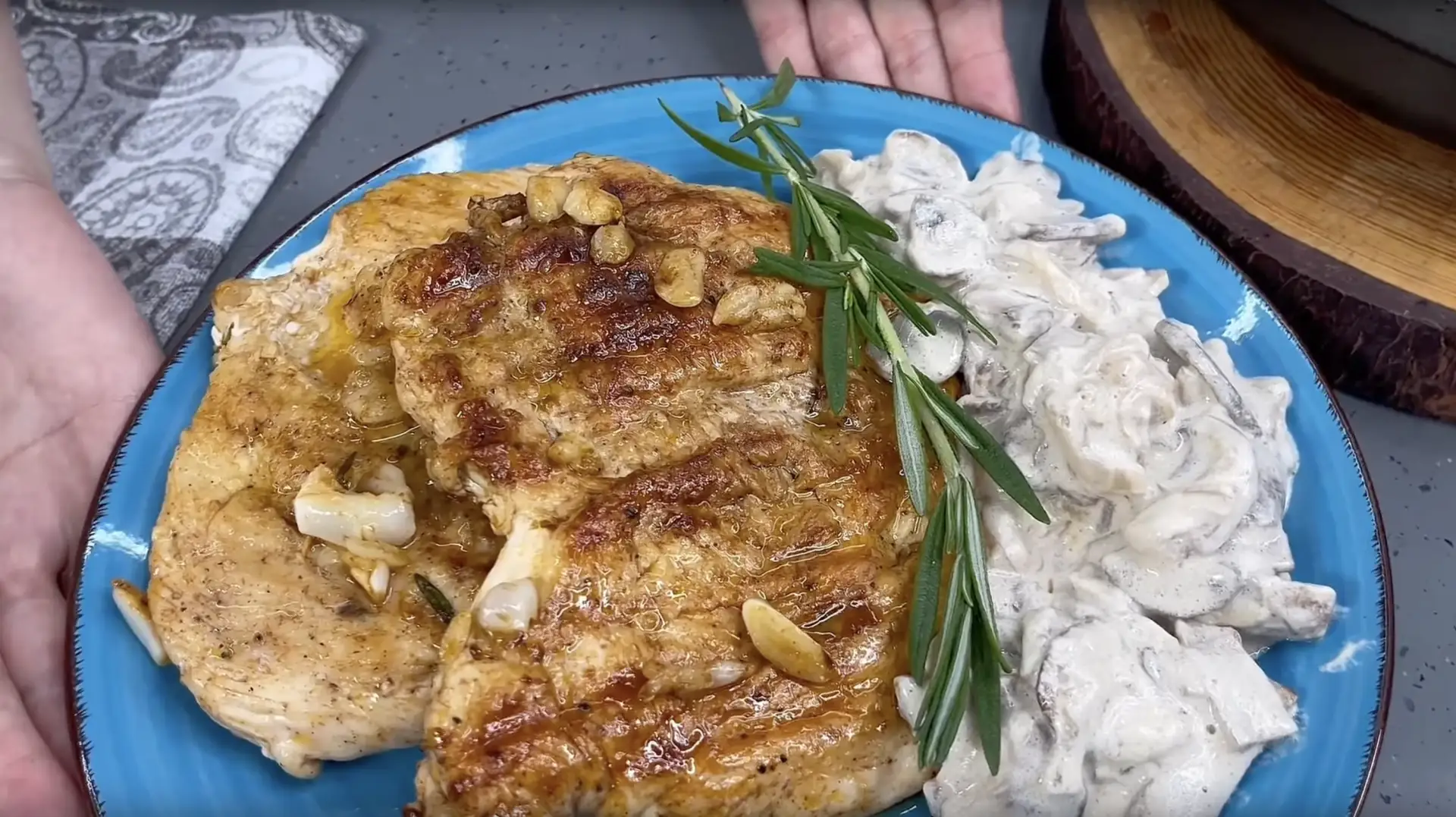 На подогретое блюдо выкладываем куриную грудку, щедро поливаем теплым грибным соусом или выкладываем его рядом на тарелку. Веточка свежего розмарина — и готово!