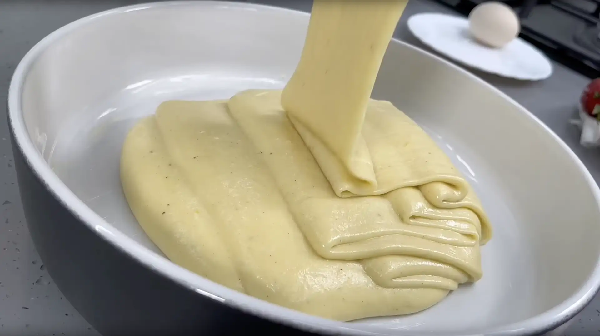 4. Оставляем тесто на столе минут на 10, за это время мука набухнет и тесто слегка загустеет. После чего вливаем оставшиеся сливки, перемешиваем и тесто готово!
