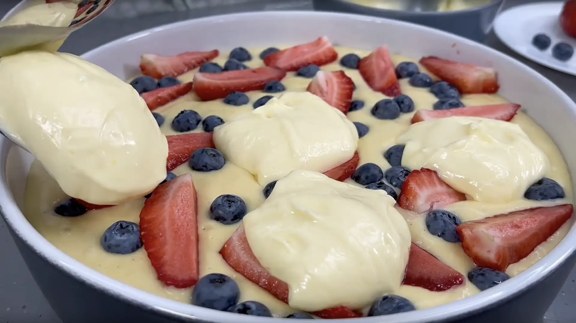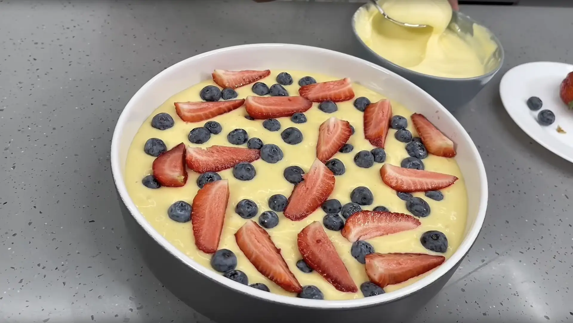 3. Сборка. В смазанную сливочным маслом форму (26см) выливаем тесто. 🥄 Выкладываем сверху горсть ягод (замороженные не размораживаем, но обваливаем в ложке крахмала, чтобы пирог не «поплыл»). А теперь — волшебство: поверх ягод аккуратно выкладываем ложкой крем.