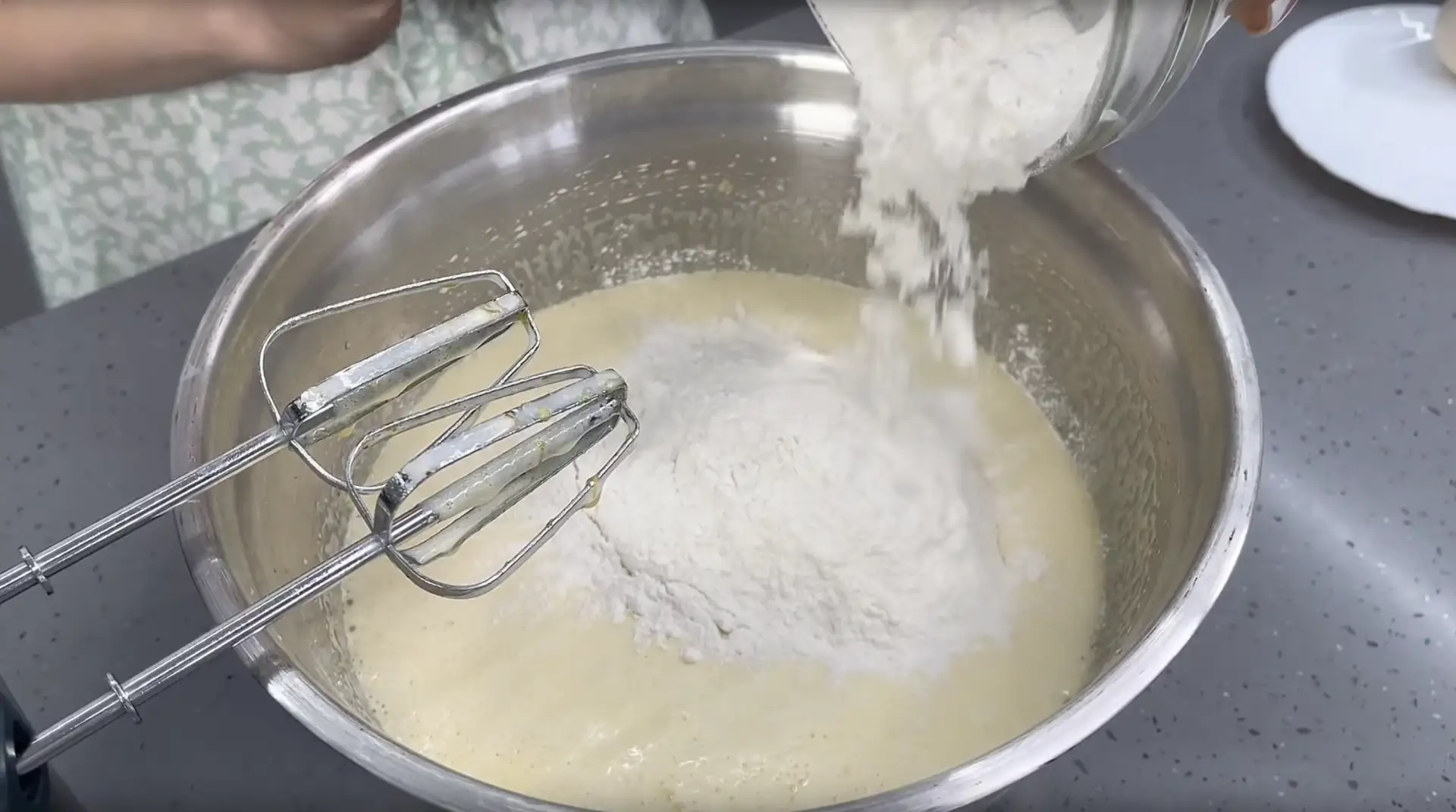 2. Вливаем теплое молоко, добавляем просеянную муку и разрыхлитель,замешиваем изначально густое тесто — так легче разбить комочки муки.