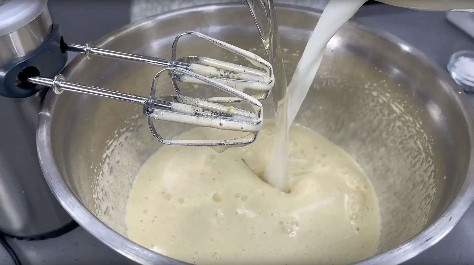3. Так благодаря чему блинчики получаются невероятно нежными и называются «Два молока»? Разбавлять тесто мы будем сливками. Можно брать сливки с разным процентом жирности — 10%, 20%. Перемешиваем тесто, доводим его до нужной консистенции — тесто должно получиться жидким (немного сливок оставляем). Вместе со сливками вливаем растительное масло и перемешиваем до однородного состояния.