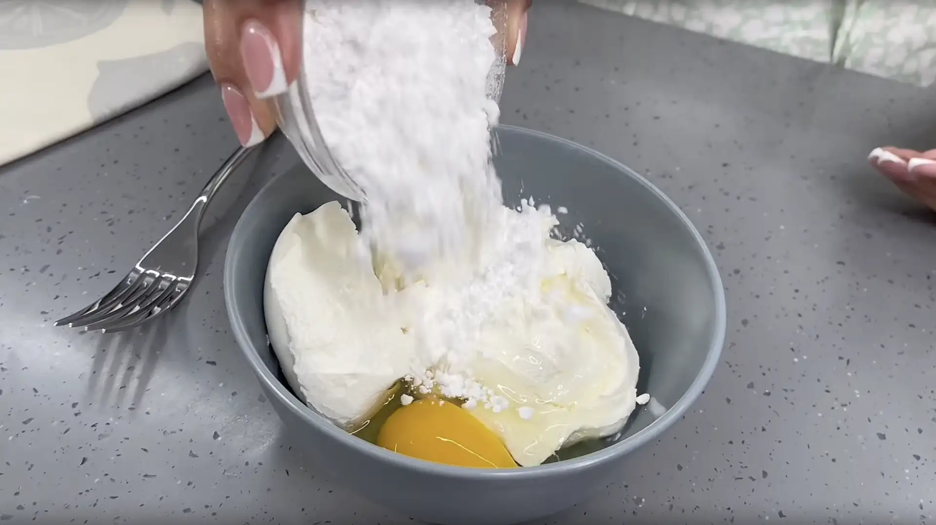 2. Секретный слой. Смешиваем в миске творожный сыр, яйцо и сахарную пудру до шелковистой гладкости. Это наша «облачная» прослойка!