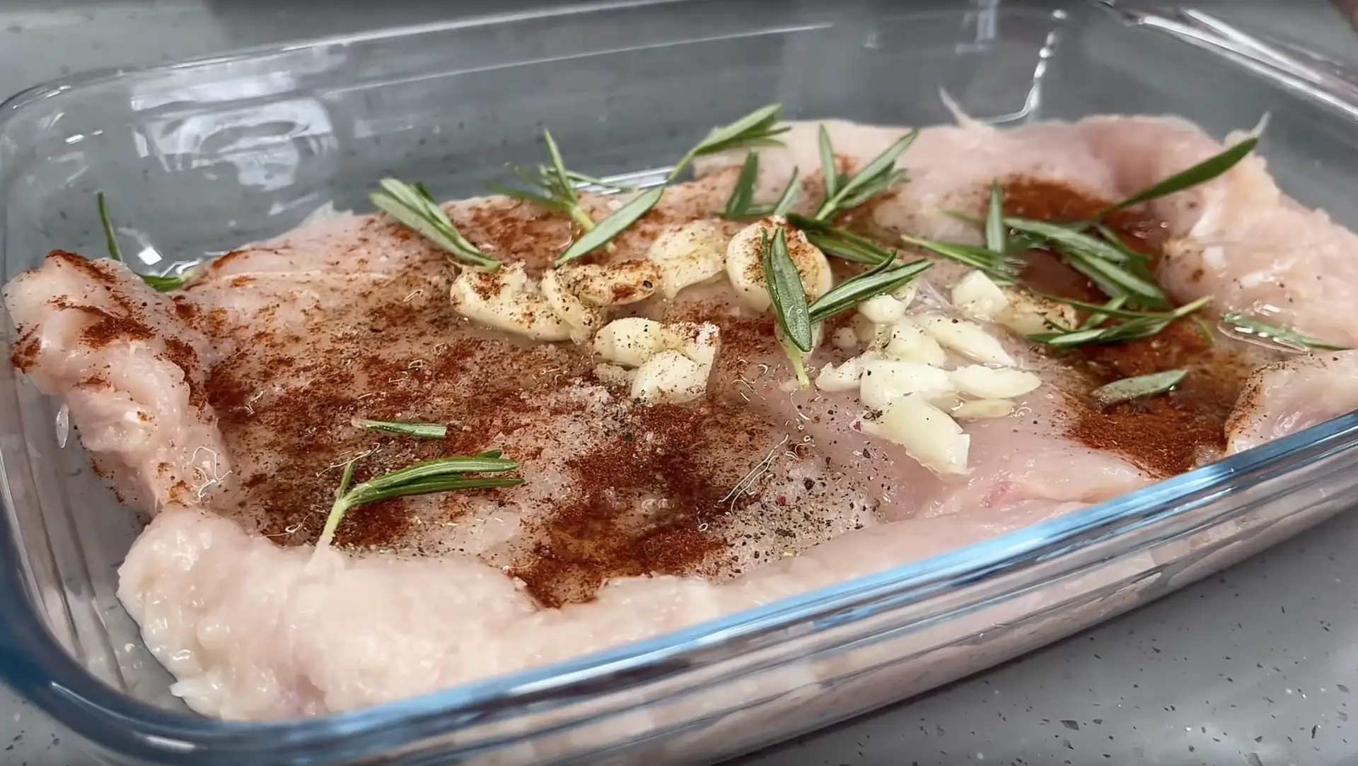 В миску отправляем раздавленный плоской стороной ножа чеснок (так он отдаст больше аромата), щедрую щепотку соли, смесь перцев (не экономьте — это букет ароматов), паприку для красивого цвета и розмарин. Свежий — идеально, но сушеный тоже работает! Растительное масло поможет раскрыть вкус и аромат специй. Хорошенько натрите каждое филе, словно делаете массаж. Оставьте на 15 минут — этого достаточно для проникновения ароматов, но не для разрушения волокон.