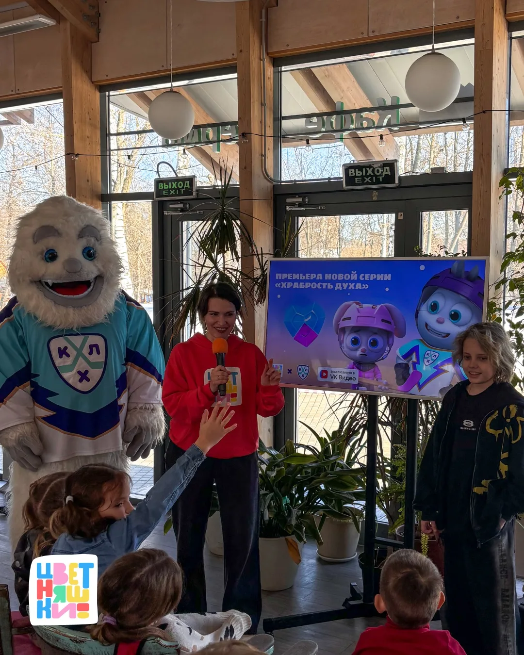 Гости не только все вместе посмотрели серии Цветняшек, но и пообщались с режиссером Гаянэ Охота и актером озвучания Никитой Данько, а также успели сделать классные фотки с талисманом КХЛ — Крутом😎