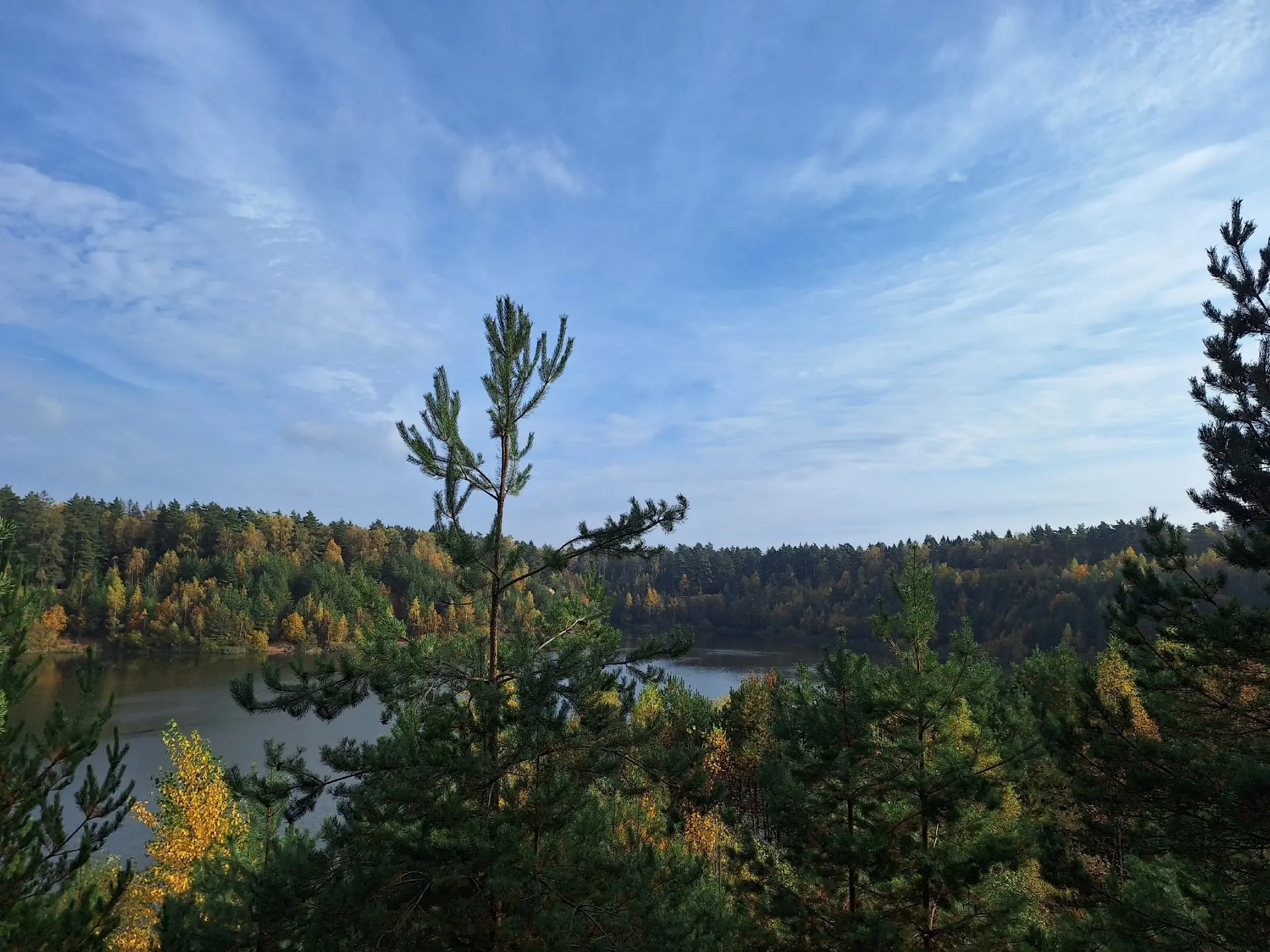 На фотографии изображен живописный пейзаж с озером, окруженным лесом. Небо ясное, с небольшими облаками, что создает ощущение спокойствия и умиротворения. Лес состоит из различных деревьев, включая хвойные и лиственные породы, что придает ему разнообразие и красоту. Это место идеально подходит для отдыха на природе, прогулок и наслаждения свежим воздухом. #природа #озеро #лес #отдых #спокойствие #красота #пейзаж #прогулка #свежийвоздух #Тучково