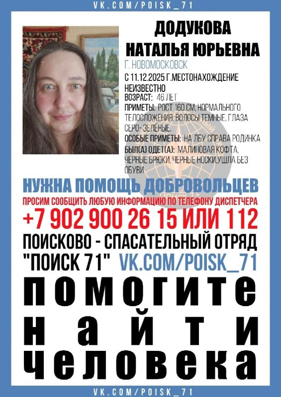 Добровольческий поисково-спасательный отряд «Поиск 71» опубликовал ориентировку на пропавшую жительницу Новомосковска. 46-летняя Наталья Додукова ушла в неизвестном направлении.
