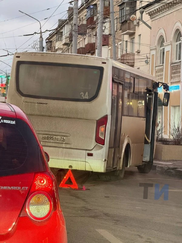 Дорожный инцидент произошел в самом центре Тулы. Два автобуса не поделили дорогу недалеко от перекрестка с Красноармейским проспектом.