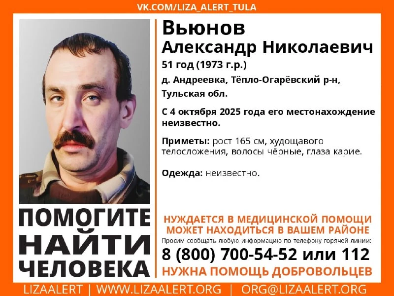 Поисковый отряд «Лиза Алерт» объявил о пропаже Александра Вьюнова, 1974 года рождения. Его местонахождение неизвестно с 4 октября.
