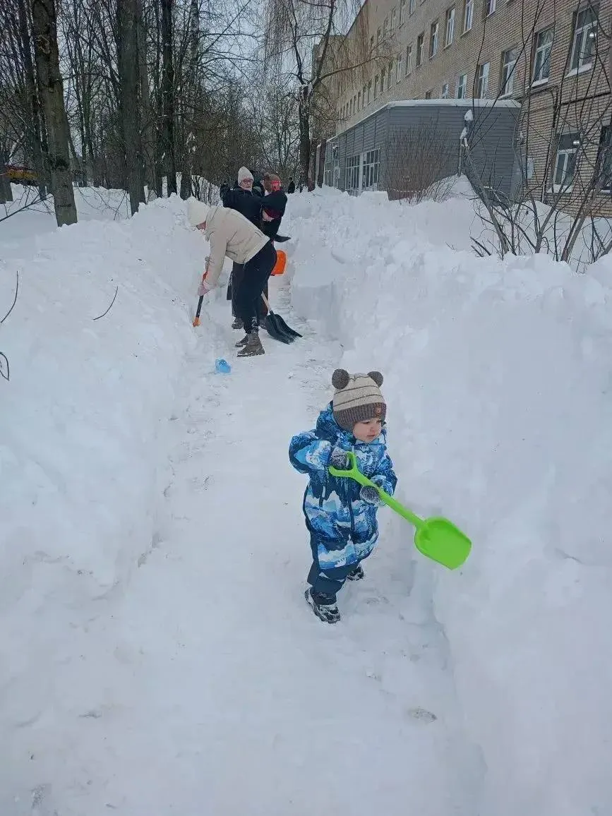 На борьбу со снегом выходят жители разных возрастов. Даже малыши вносят свой маленький, но важный вклад.
