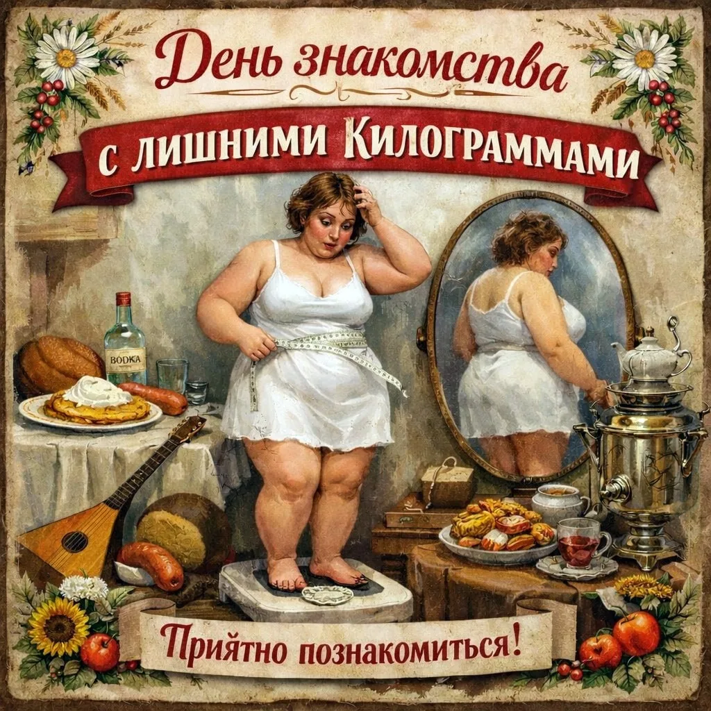 Сегодня самый необычный праздник — предлагается встретиться лицом к лицу с теми килограммами, что «затаились» на боках и талии 😅 Пригласите их на чаёк ☕️, поболтайте, спросите у каждого имя, узнайте их секреты и… просто подружитесь!