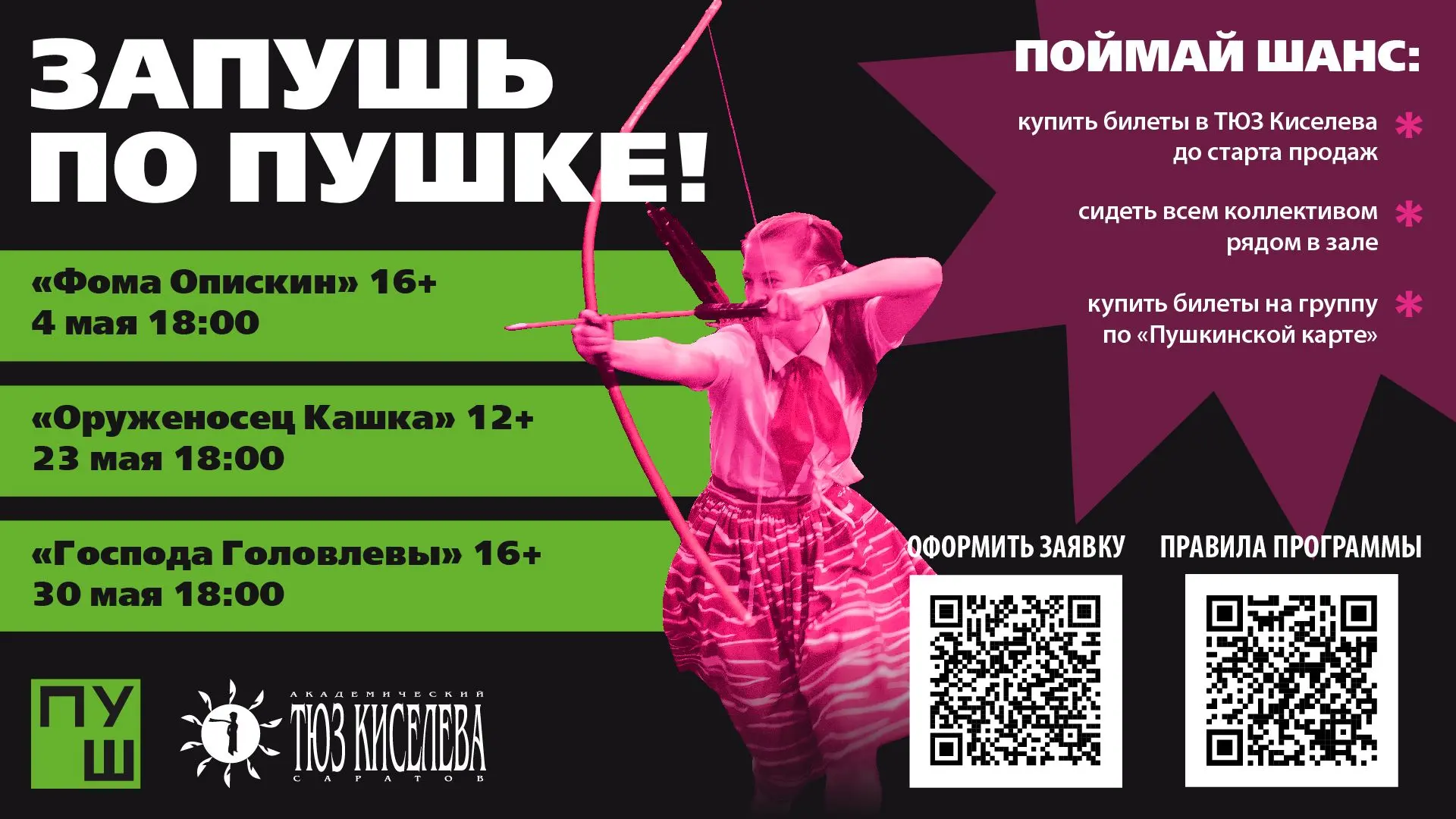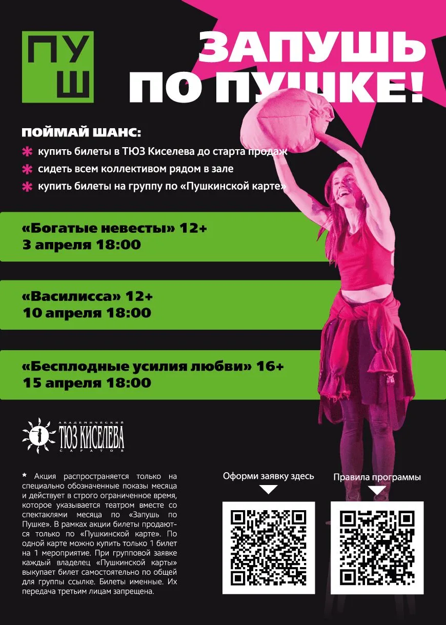 🔹 билеты на спектакли, отмеченные акциями «Запушь по Пушке» и «Классный выбор», частично или полностью проданы в рамках акций