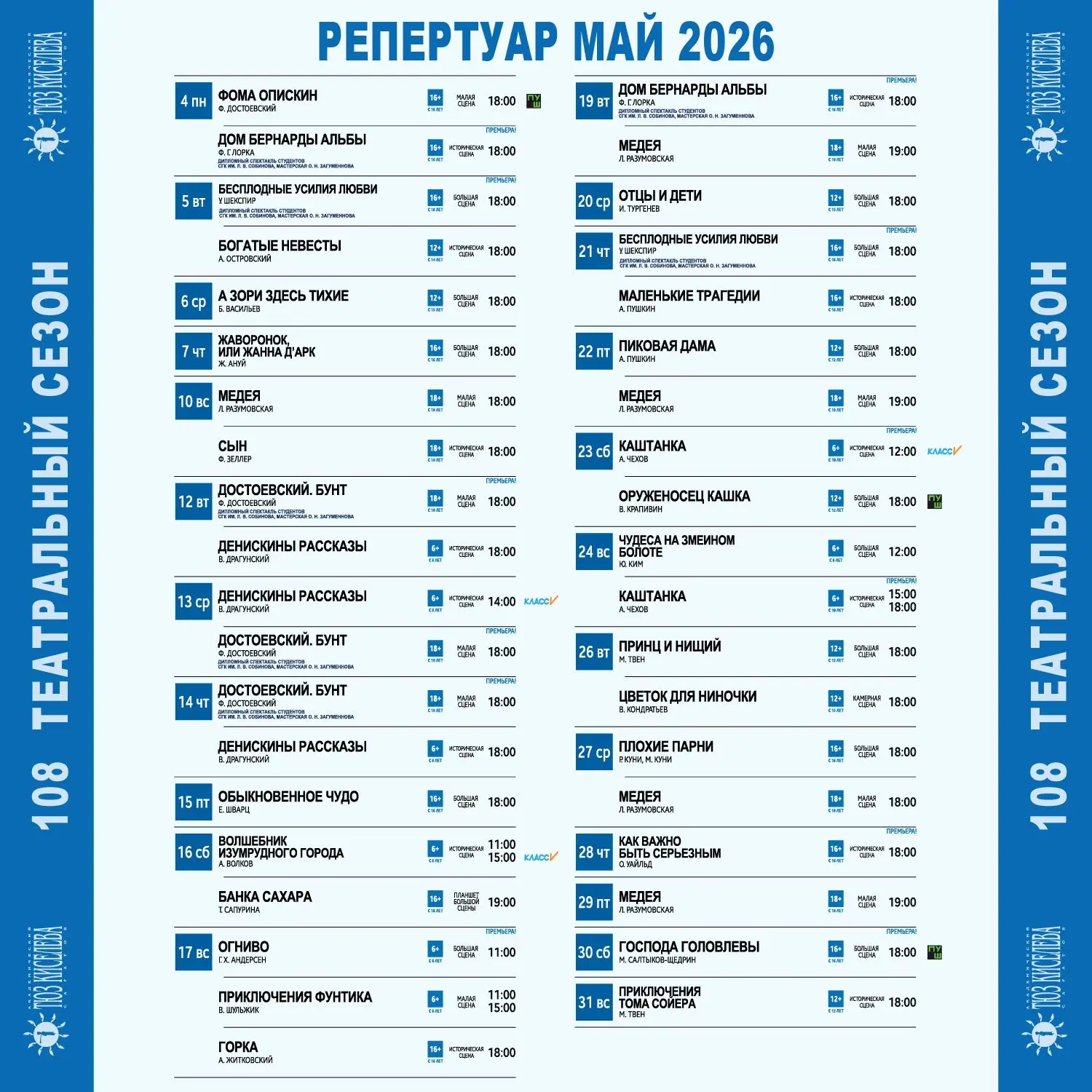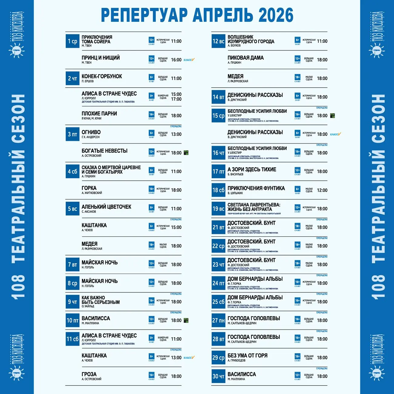 🔹 Удобный поиск по репертуару — фильтры по дате, сцене, возрасту и наличию билетов