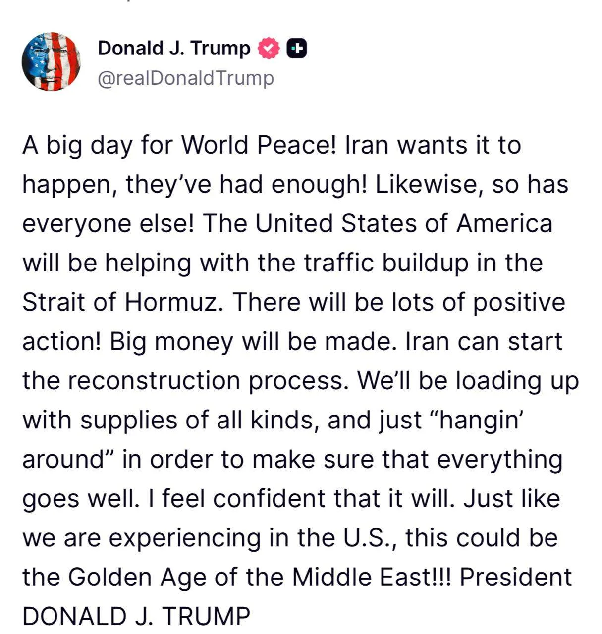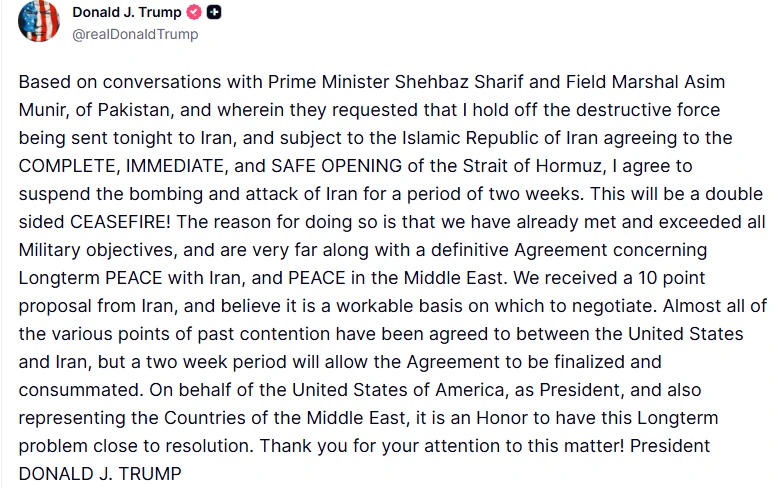 «По итогам разговоров с премьер-министром Пакистана Шехбазом Шарифом и фельдмаршалом Асимом Муниром <…> я соглашаюсь приостановить бомбардировки и атаку на Иран сроком на две недели. Это будет двустороннее прекращение огня».