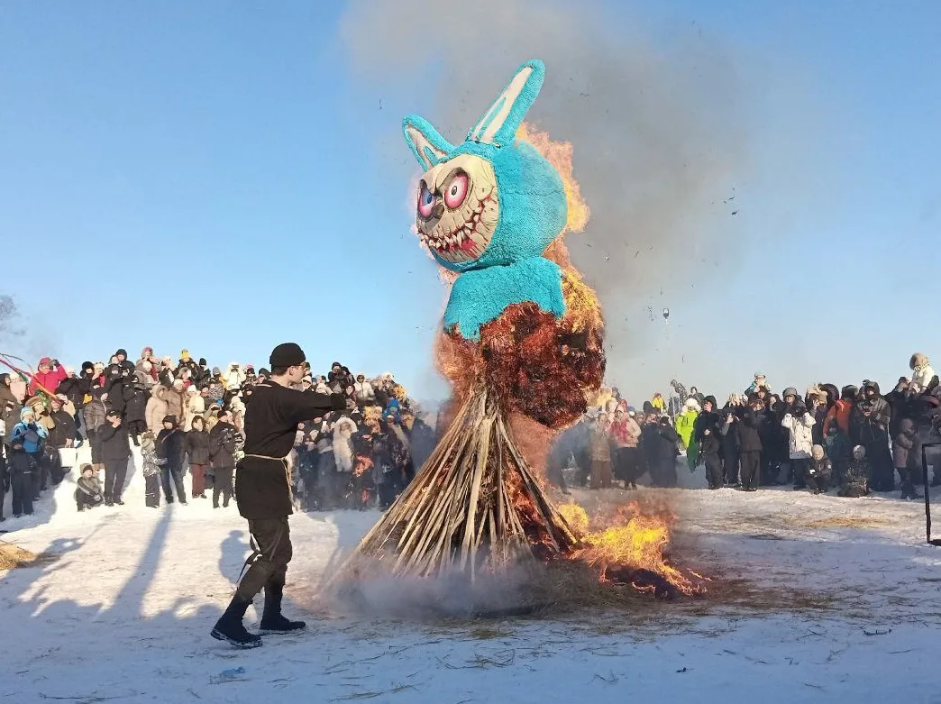 Трехметровую злобную лабубу сожгли на Масленицу в Липецкой области.