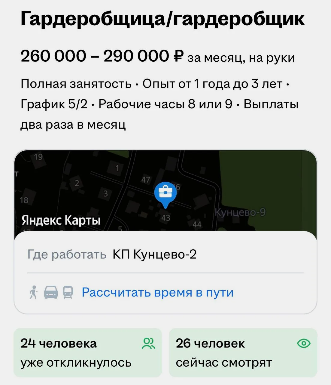 290 тысяч рублей предлагают за работу гардеробщика в Подмосковье. Такая вакансия появилась в сети.
