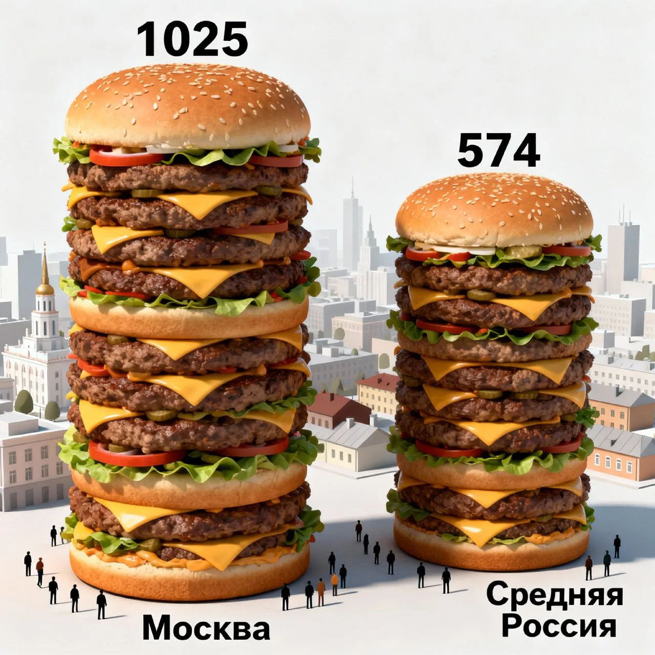 Приготовьтесь к пищевому шоку! Средний москвич теперь может позволить себе целую бургерную вечеринку — 1025 бургеров на свою месячную зарплату.