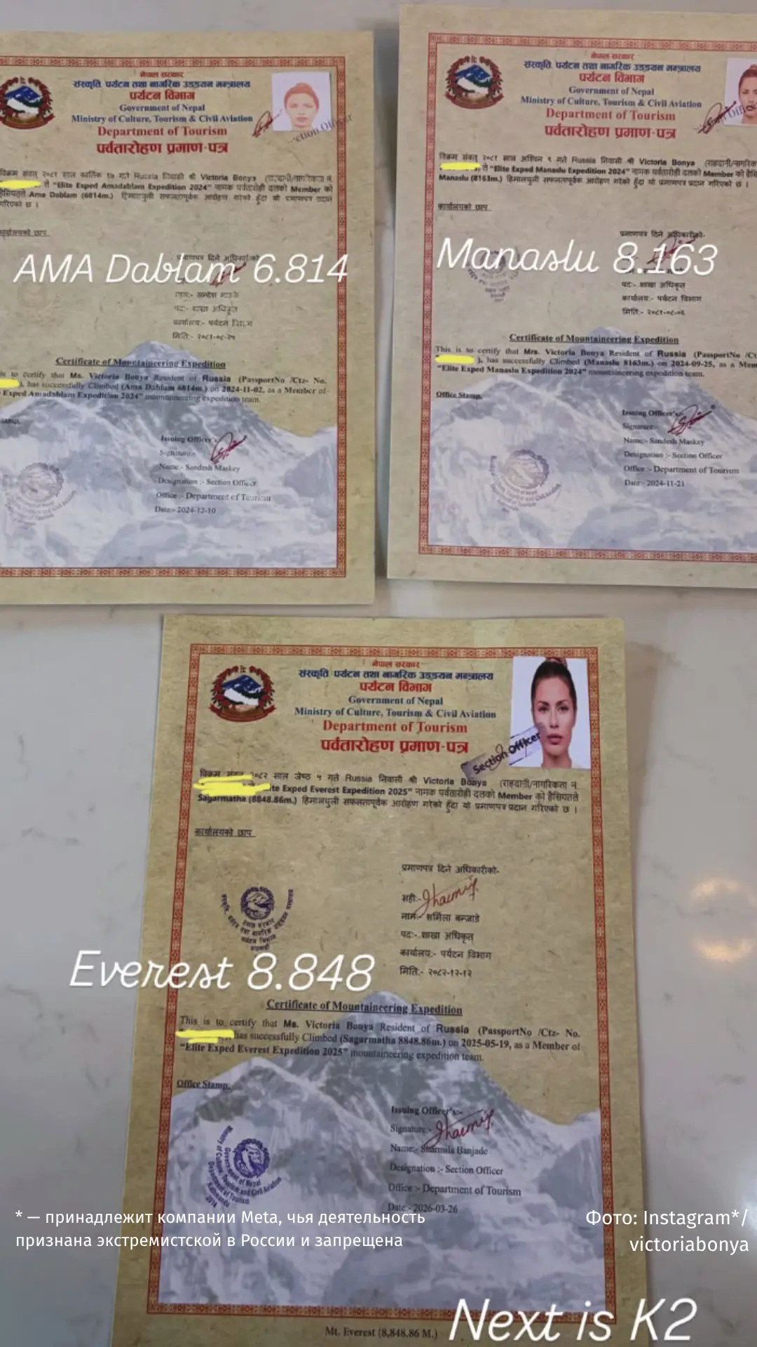 Боня добавила, что это уже третий подобный документ в ее коллекции — два из них связаны с восьмитысячниками, а третий «на подходе».