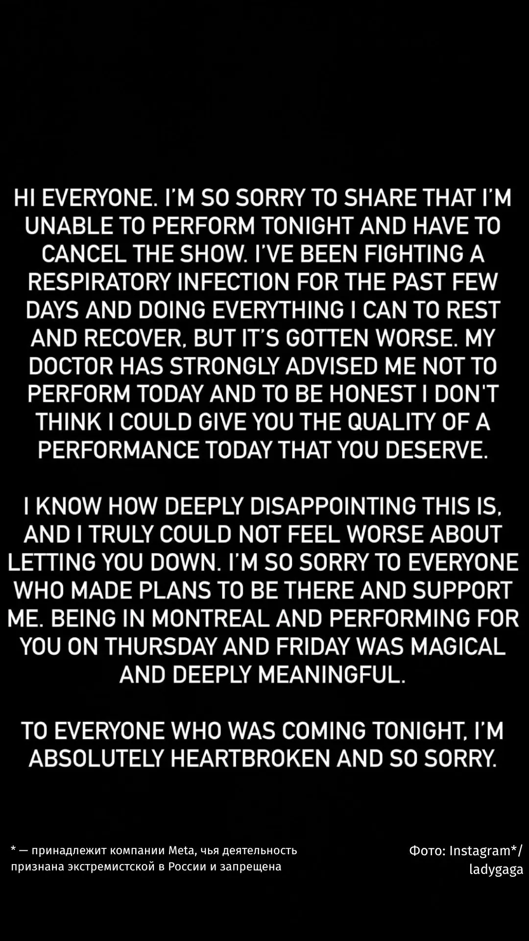Леди Гага разбила сердца монреальским фанатам — в понедельник вечером она отменила выступление буквально за три часа до того, как должна была выйти на сцену. Всему виной — респираторная инфекция, с которой 40-летняя певица отчаянно боролась несколько дней.