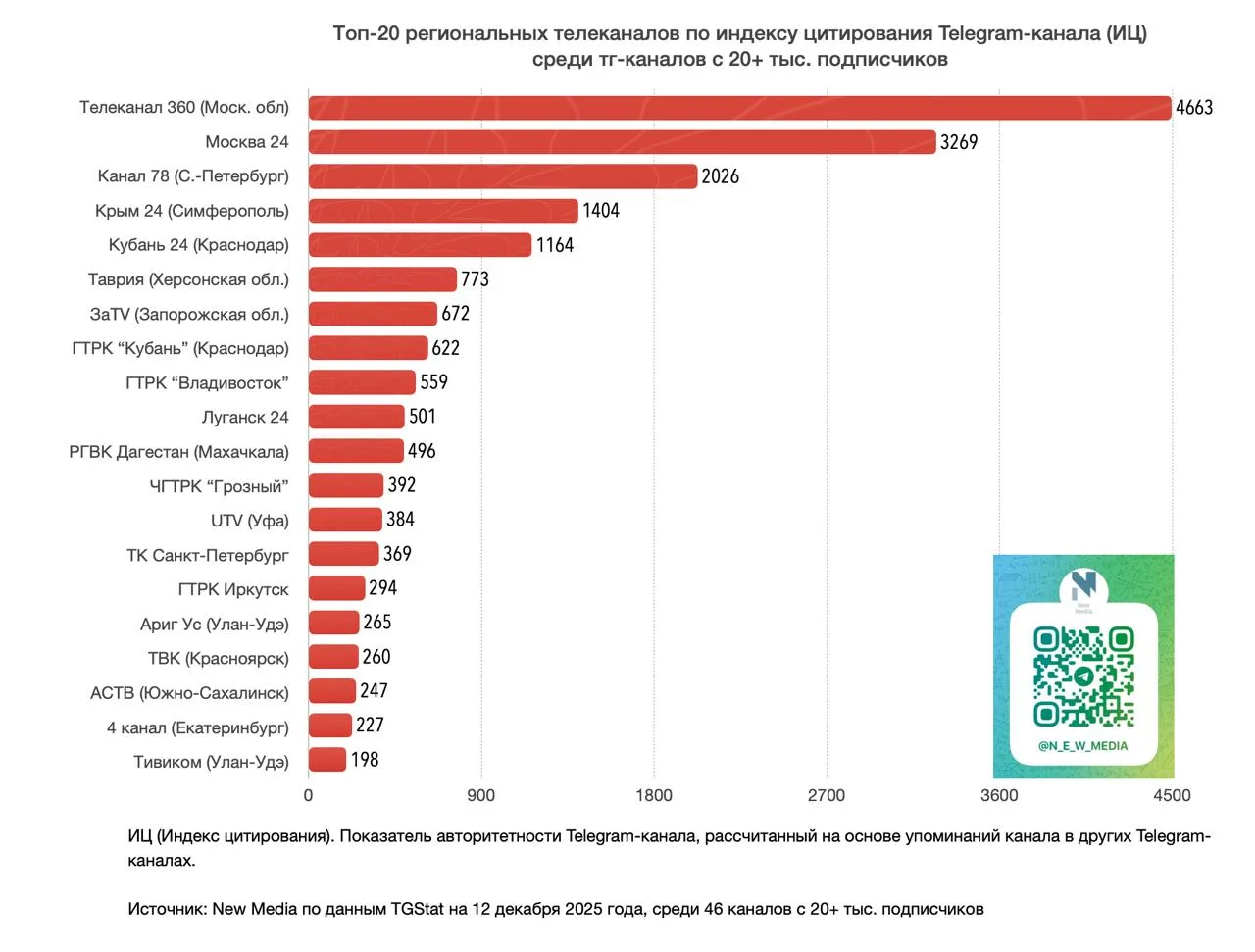 «Крым 24» занял четвертое место среди региональных телеканалов России по индексу цитирования и общему весу канала, сообщает New Media со ссылкой на данные аналитического сервиса TGStat.
