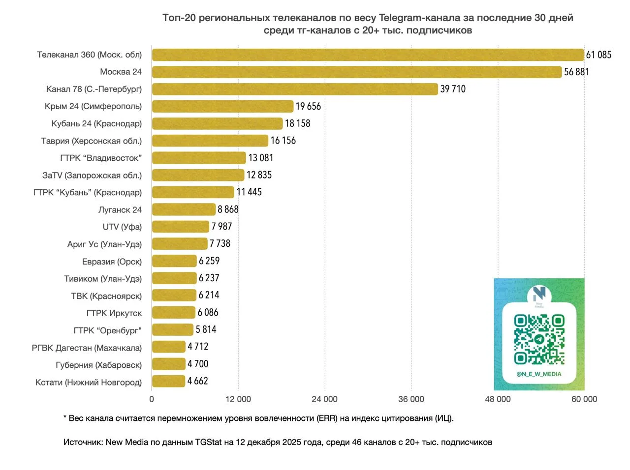 Рейтинг был составлен на основе анализа активности 46 Telegram-каналов с аудиторией от 20 тысяч подписчиков за последние 30 дней.
