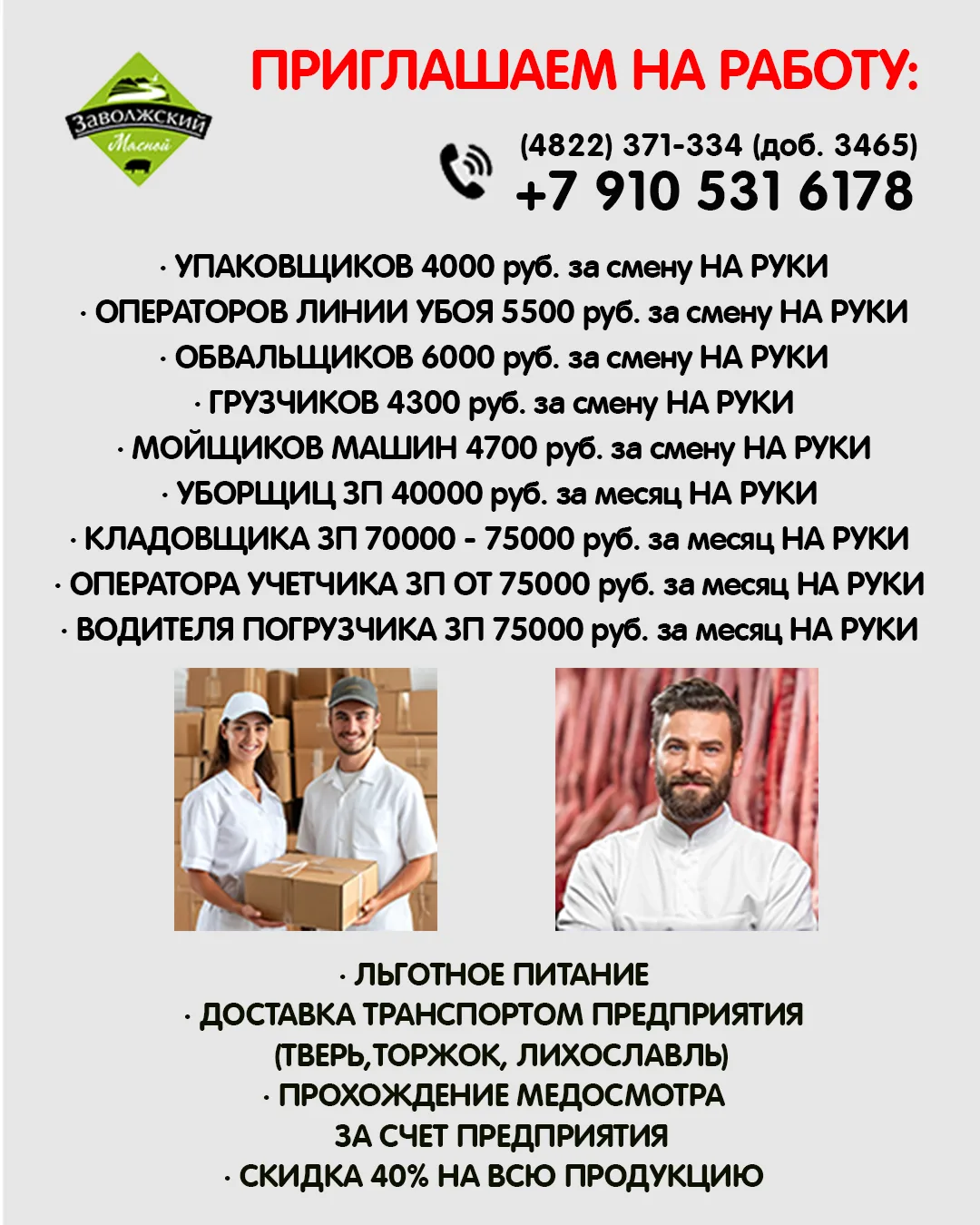 ЗАВОЛЖСКИЙ МЯСОКОМБИНАТ приглашает на работу: