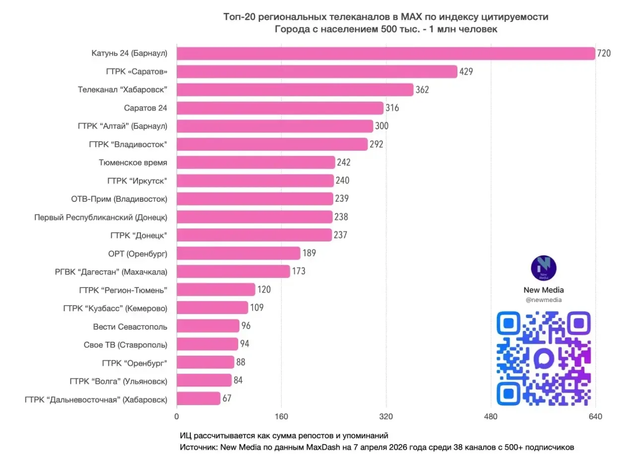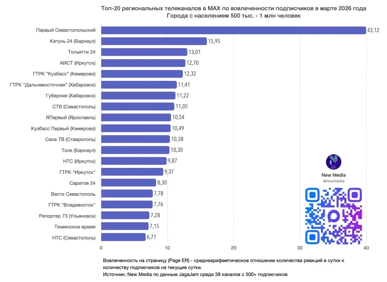 Канал New Media опубликовал итоги марта для телеканалов из городов с населением до 1 миллиона человек. По данным аналитиков, публикации «Катунь 24» в национальном мессенджере MAX посмотрели более 28 миллионов раз — это почётное второе место по всей России!