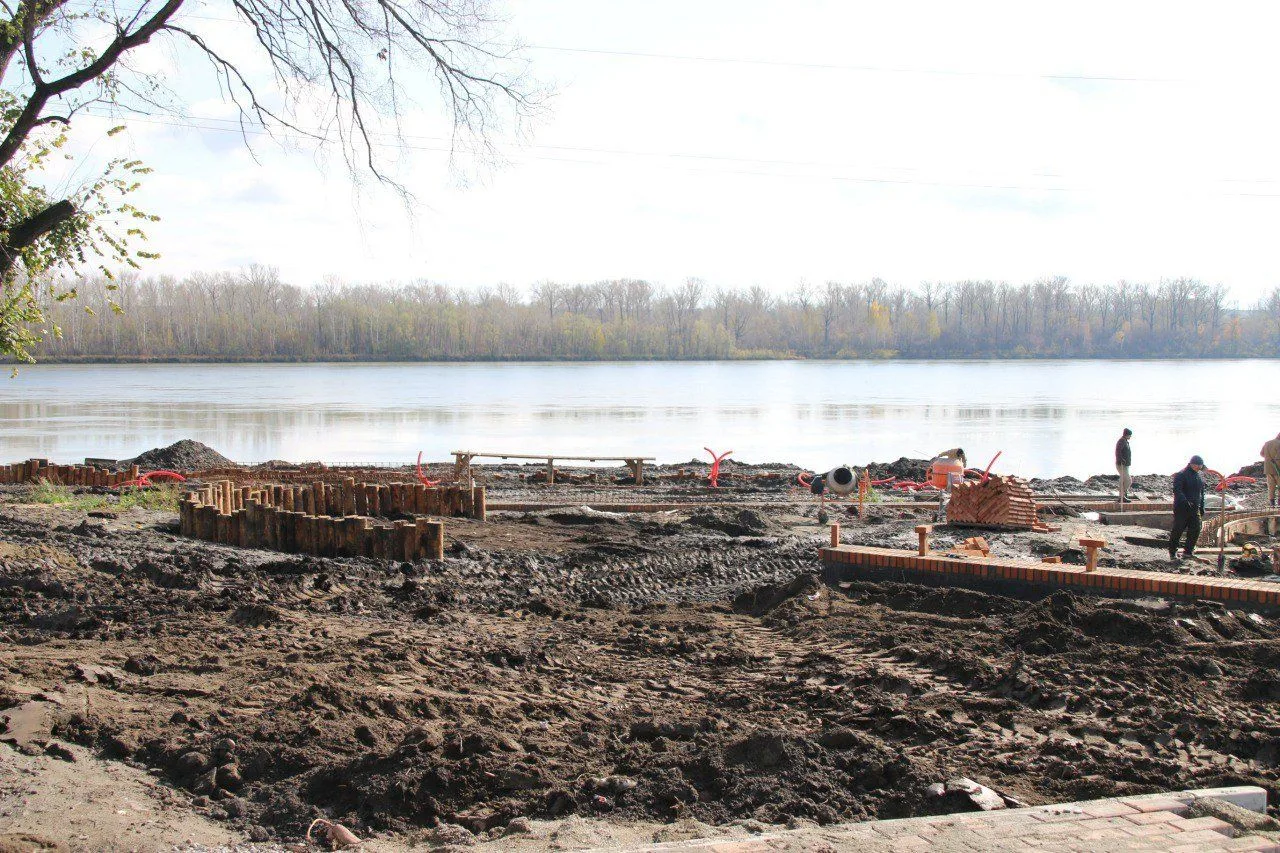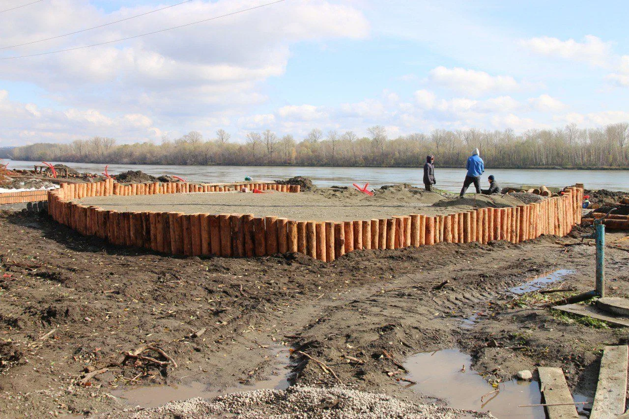 Работы находятся в активной фазе: ведётся строительство лестницы, устанавливаются каркасы, завершается монтаж свай на террасах вдоль реки.