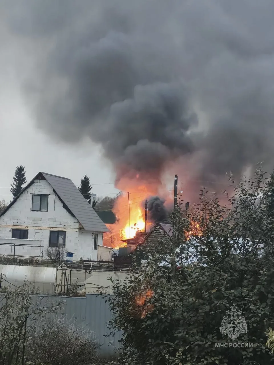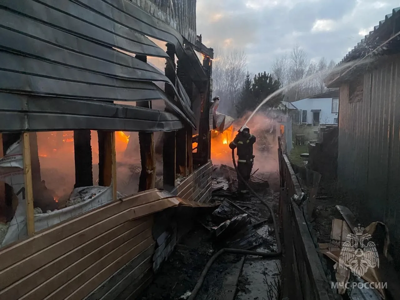 В результате пожара повреждены двухэтажный дом, деревянная беседка, стена бани, стена гаража, а также сайдинг на соседнем доме. Предварительная причина пожара — нарушение правил монтажа электрооборудования.