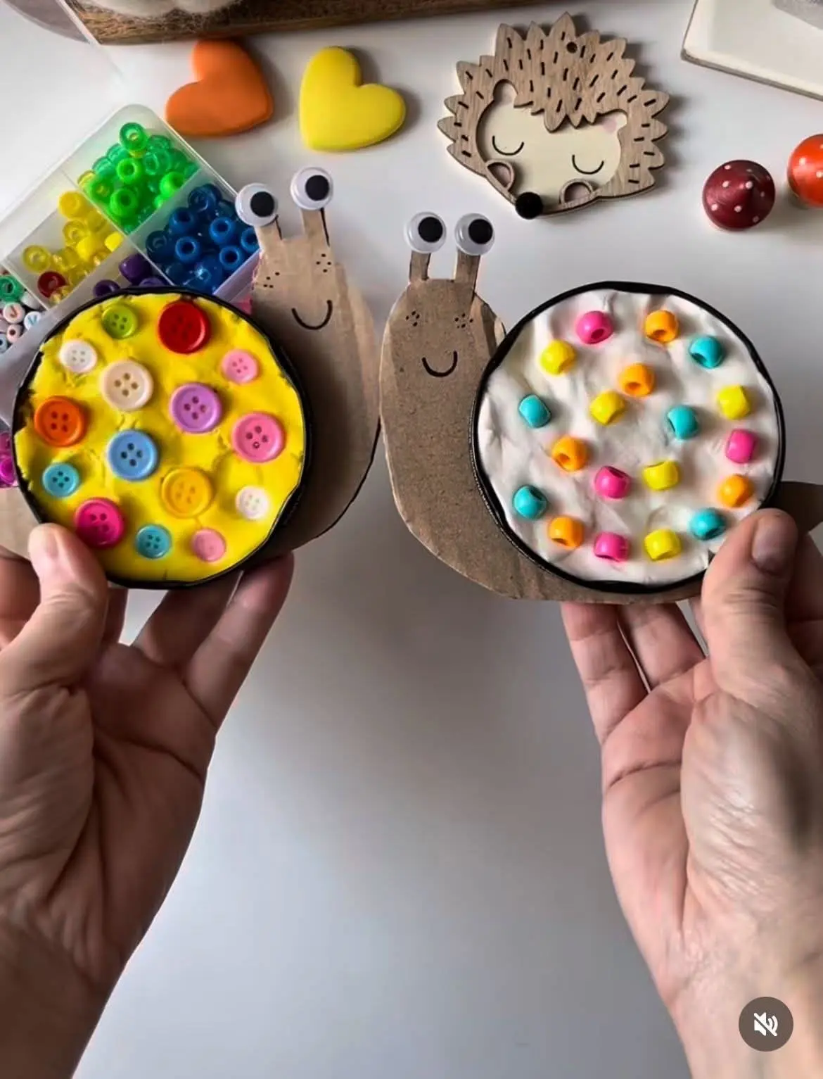 Из плотного картона вырезаем улитку, панцирь покрываем пластилином! А затем украшаем бусинами/пуговицами!