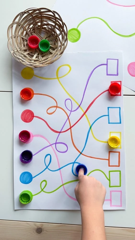 Просто нарисуйте цветные дорожки, и возьмите крышки от бутылок разных цветов.