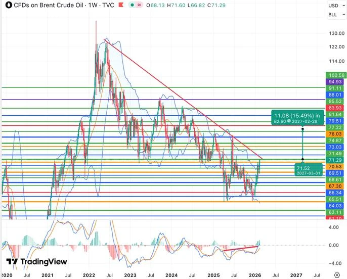 📊С технической точки зрения котировки Brent в четверг подошли к линии долгосрочного медвежьего тренда, а также поднялись выше средней полосы Боллинджера месячного графика (70,60 долл/барр). Краткосрочные, среднесрочные и долгосрочные сигналы по фьючерсам при этом позитивны и указывают на готовность цен продолжить восходящее движение с возможной первой целью повышения к максимуму 2025 года 82,58 долл/барр (также верхняя полоса Боллинджера месячного графика) при реализации бычьего сценария, что предполагает потенциал роста порядка 15,5%.