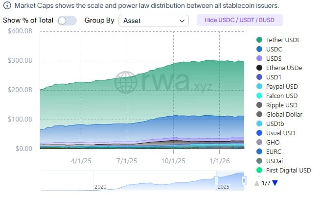 Несмотря на спад USDT, общий рынок стейблкоинов продолжает расти. По данным аналитиков, совокупное предложение достигло $304,6 млрд. Конкурент USDC от Circle Internet Group прибавил почти 5% и вырос до $75,7 млрд.