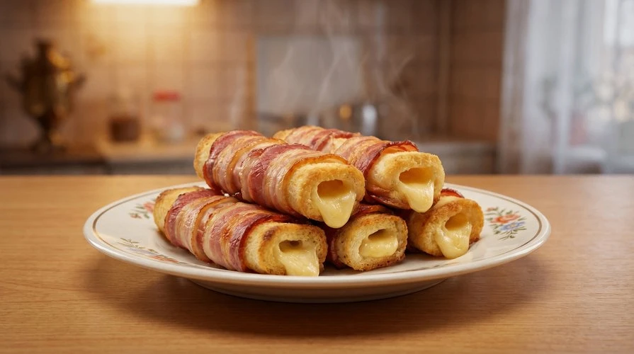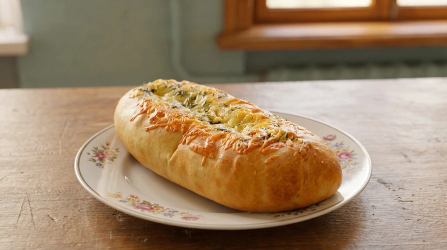 Хрустящий батон, намазанный сливочным и плавленым сыром с чесноком и зеленью, запечённый до румяной корочки.