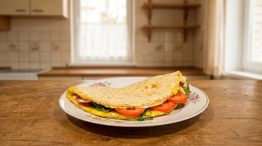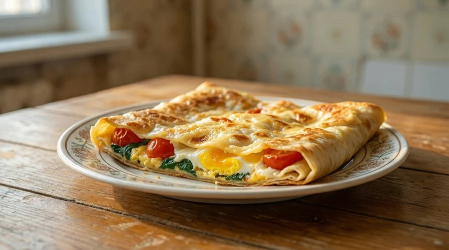 Быстрый и сытный завтрак — хрустящая основа из тортильи или лаваша с начинкой из яиц, творожного сыра, черри, моцареллы и шпината.