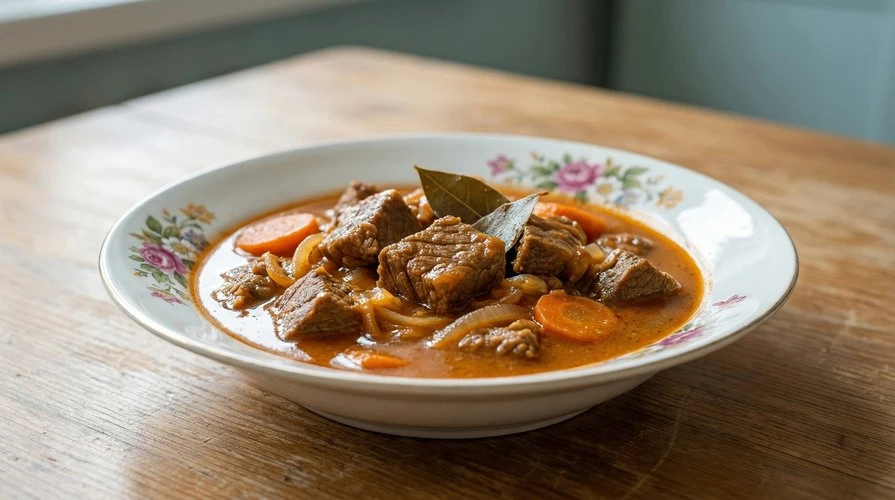 Мягкое, тающее во рту мясо в густой ароматной подливе с луком, морковью и лавровым листом.