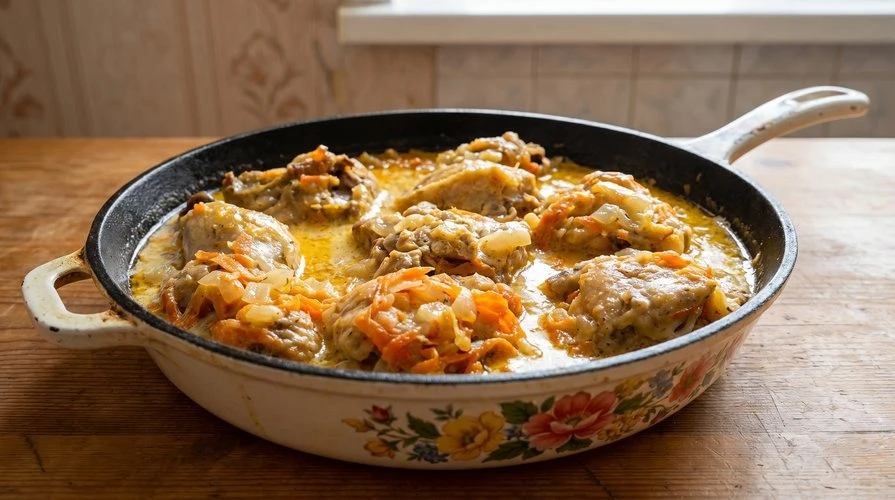 Куриные бёдра в сметанном соусе с овощами