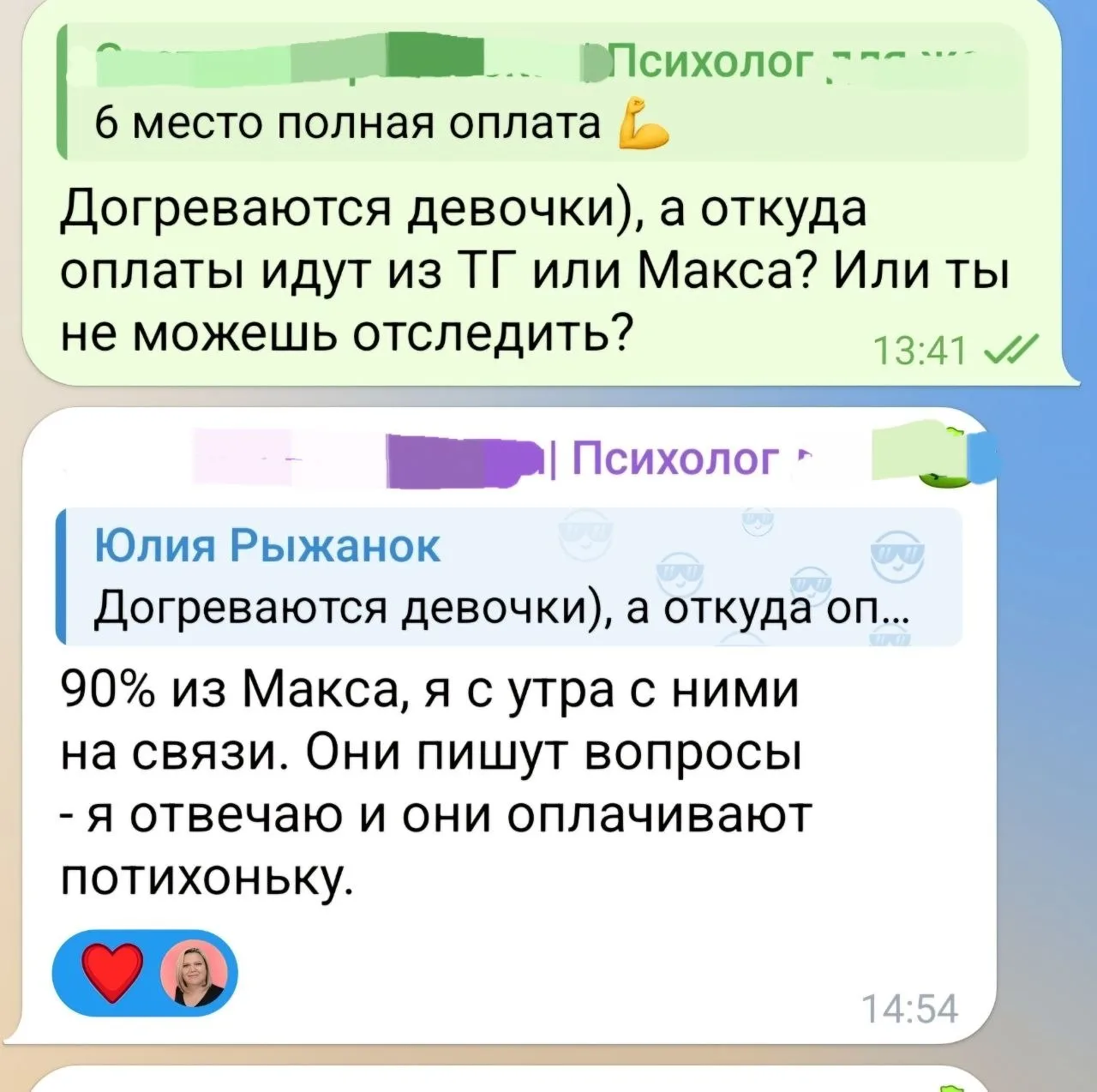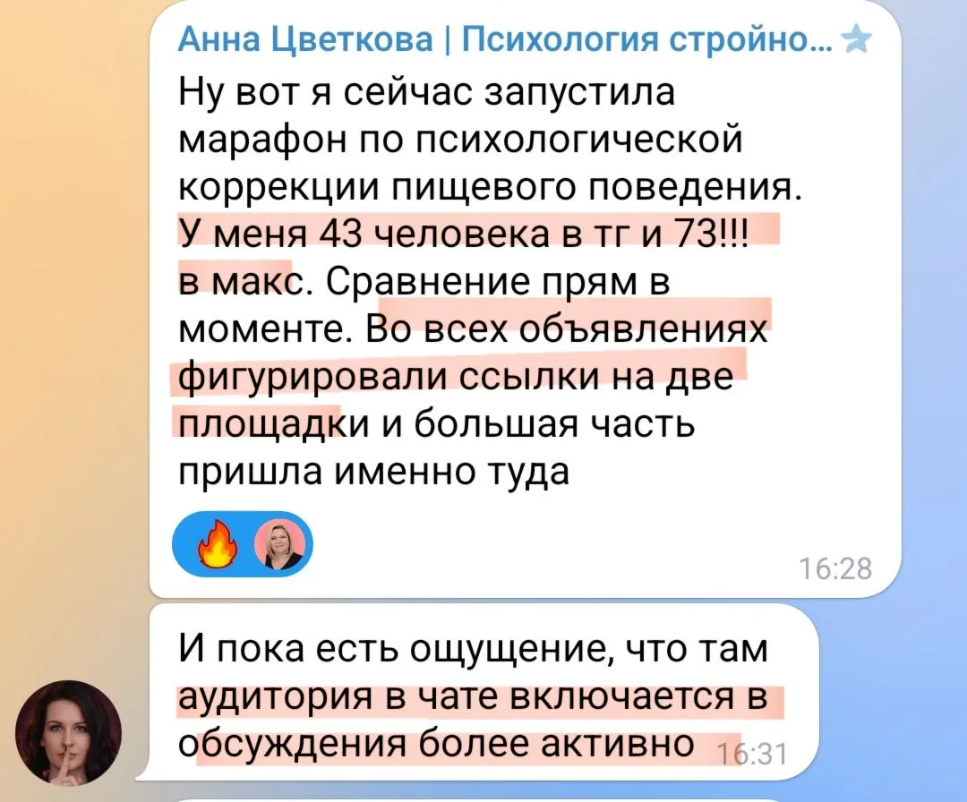 У клиентки-психолога еще круче: она дублировала запуск на ТГ и Макс, и 90% оплат пришло именно из Макса.