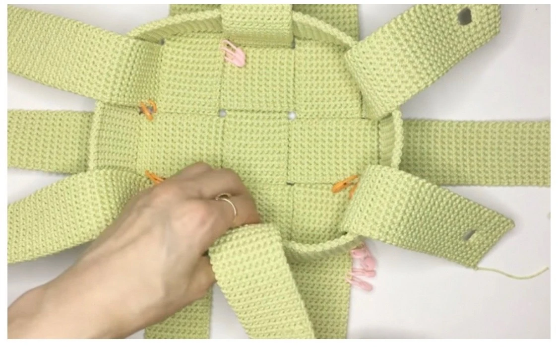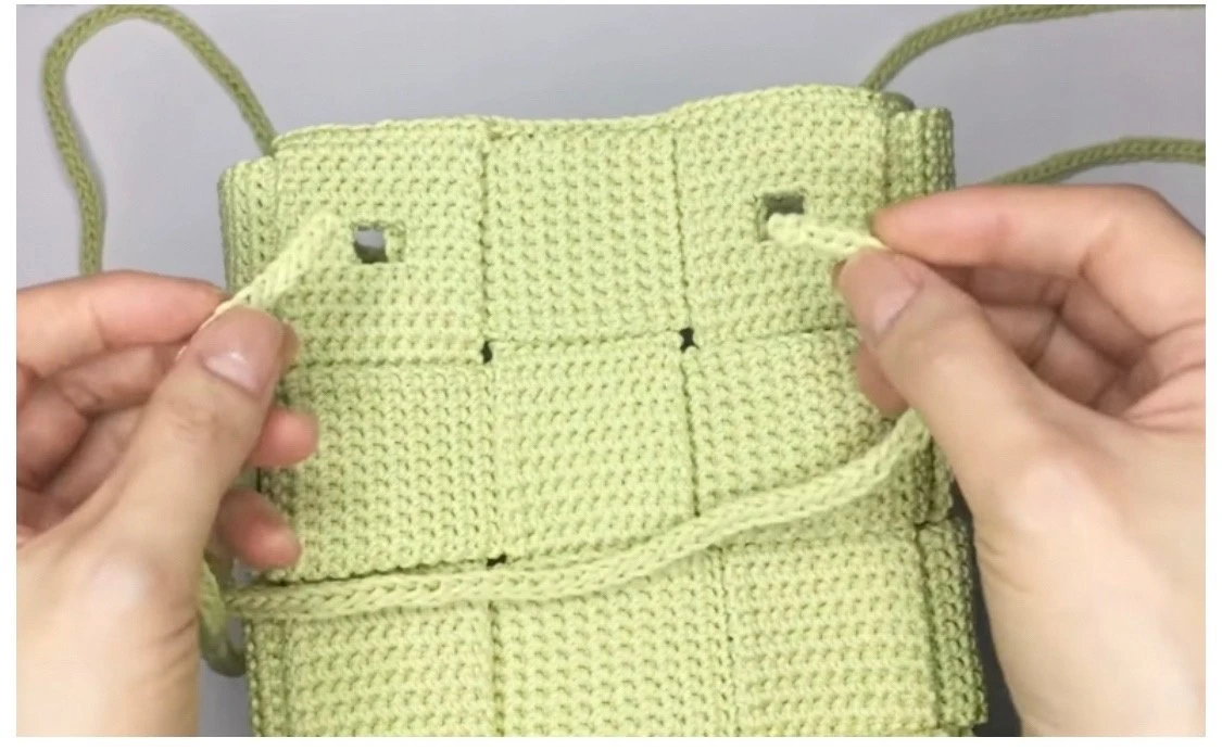 Секрет заключается в том, что все детали сумки представляют собой обычные полосы, вязание которых просто не может вызвать каких бы то ни было сложностей. Всего полос 9. Часть из них имеет окошечки под шнур, но и здесь ничего сложного. Вертикальные и горизонтальные полосы вяжутся по одному и тому же принципу. Главное выдержать нужный размер, а затем собрать все воедино.