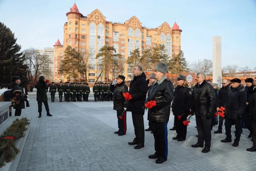 Почтили память воинов, павших при защите страны. Возложили цветы к мемориалу «Защитникам Отечества» на площади Победы в Благовещенске.